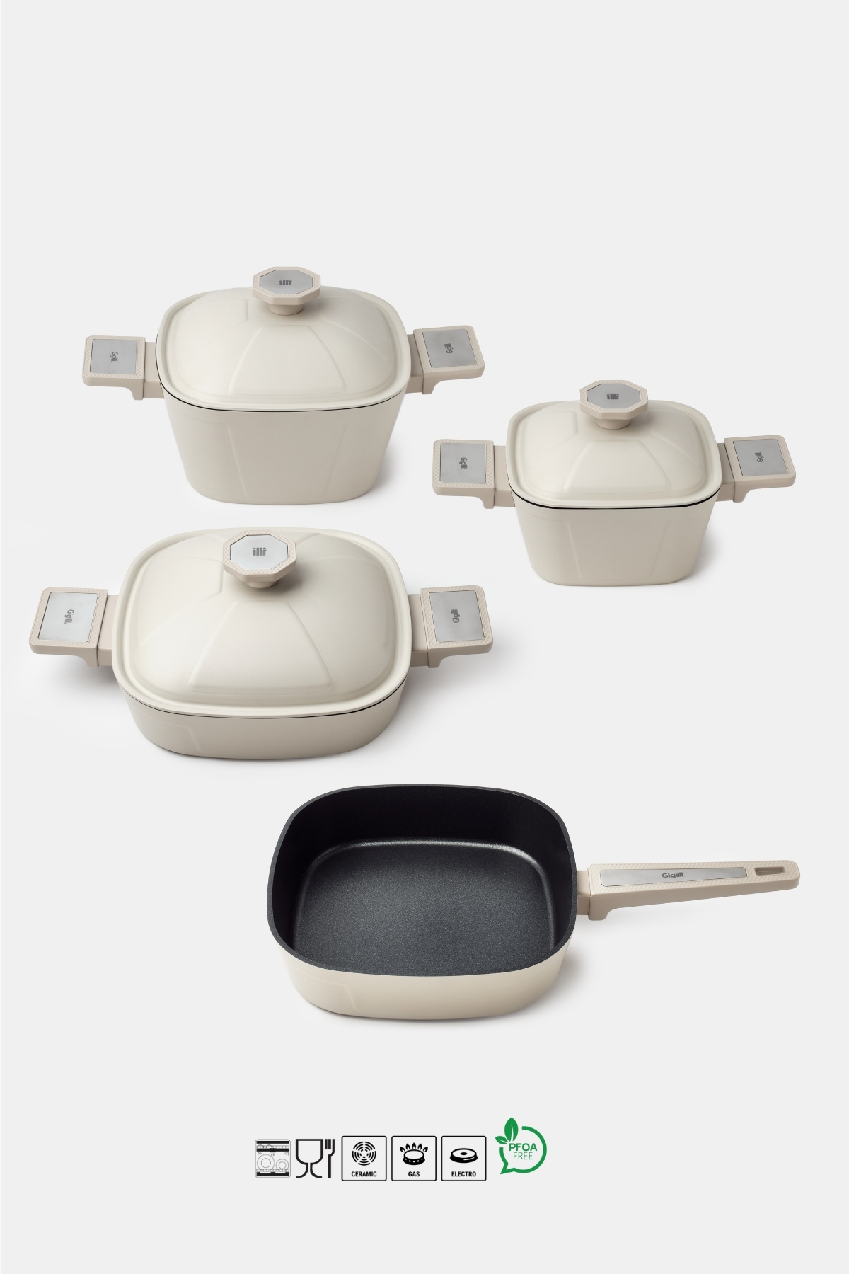 Soft-touch kulplar, elde dengeli ve rahat bir tutuş sağlarken; silikon geçmeli cam kapaklar darbelere karşı ekstra dayanıklılık sunar. Isıyı dengeli şekilde ileten gövde yapısı, yemeklerin tek noktadan değil tüm yüzey boyunca eşit pişmesine yardımcı olur.