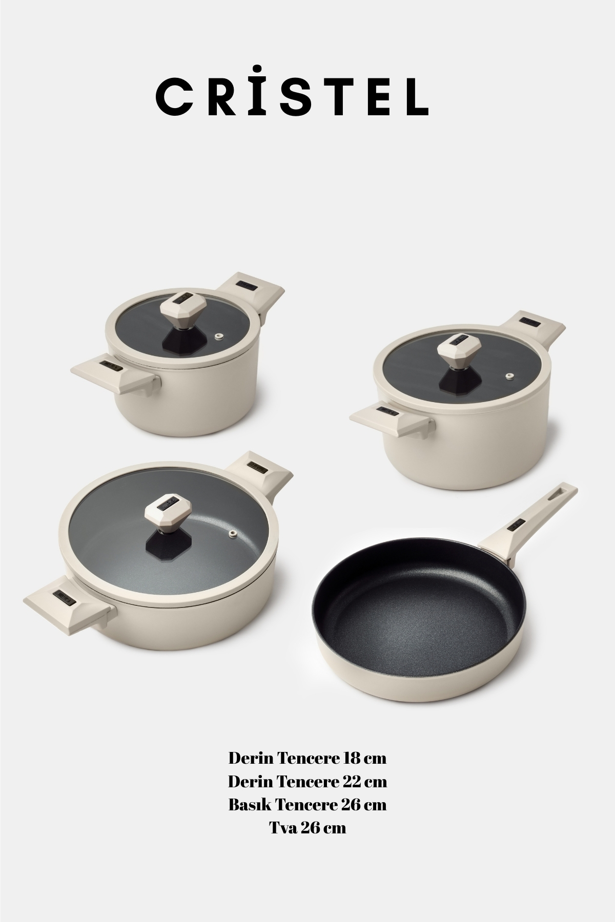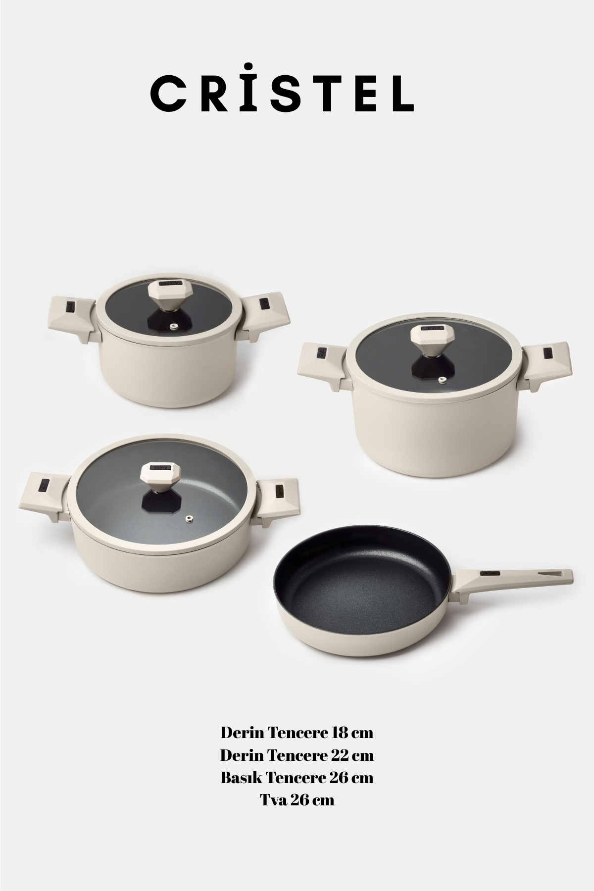 Set İçeriği: 1 adet 18 cm derin tencere, 1 adet 22 cm derin tencere, 1 adet 26 cm karnıyarık tenceresi, 1 adet 26 cm tava, 3 adet cam kapak