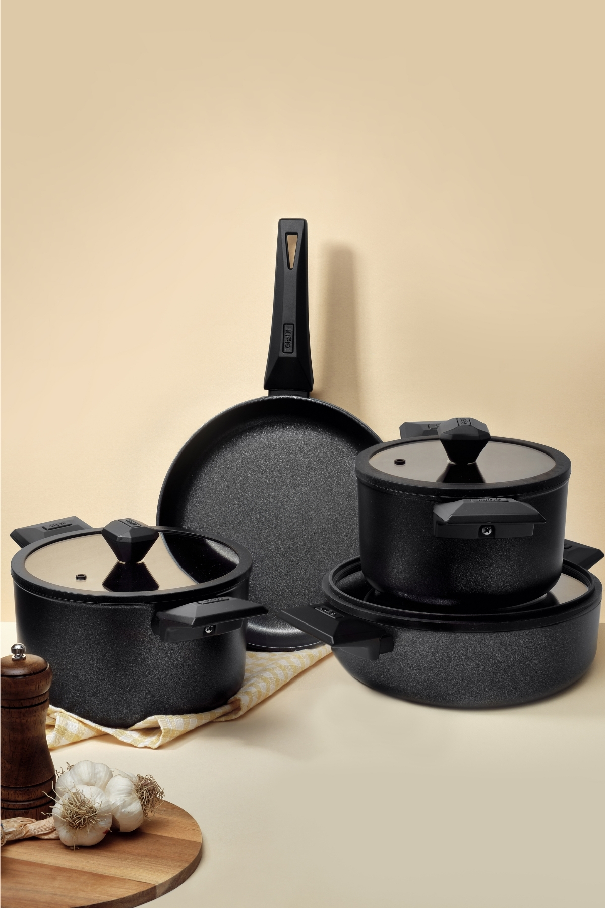Siyah ve sade tasarımıyla modern mutfaklara uyum sağlayan tencere ve tava setinin her parçası, soğuduktan sonra bulaşık makinesinde yıkanabilir. Dayanıklı yapısı ve parça çeşitliliğiyle uzun ömürlü, güvenilir bir tencere–tava seti arayanlar için güçlü bir tercihtir.