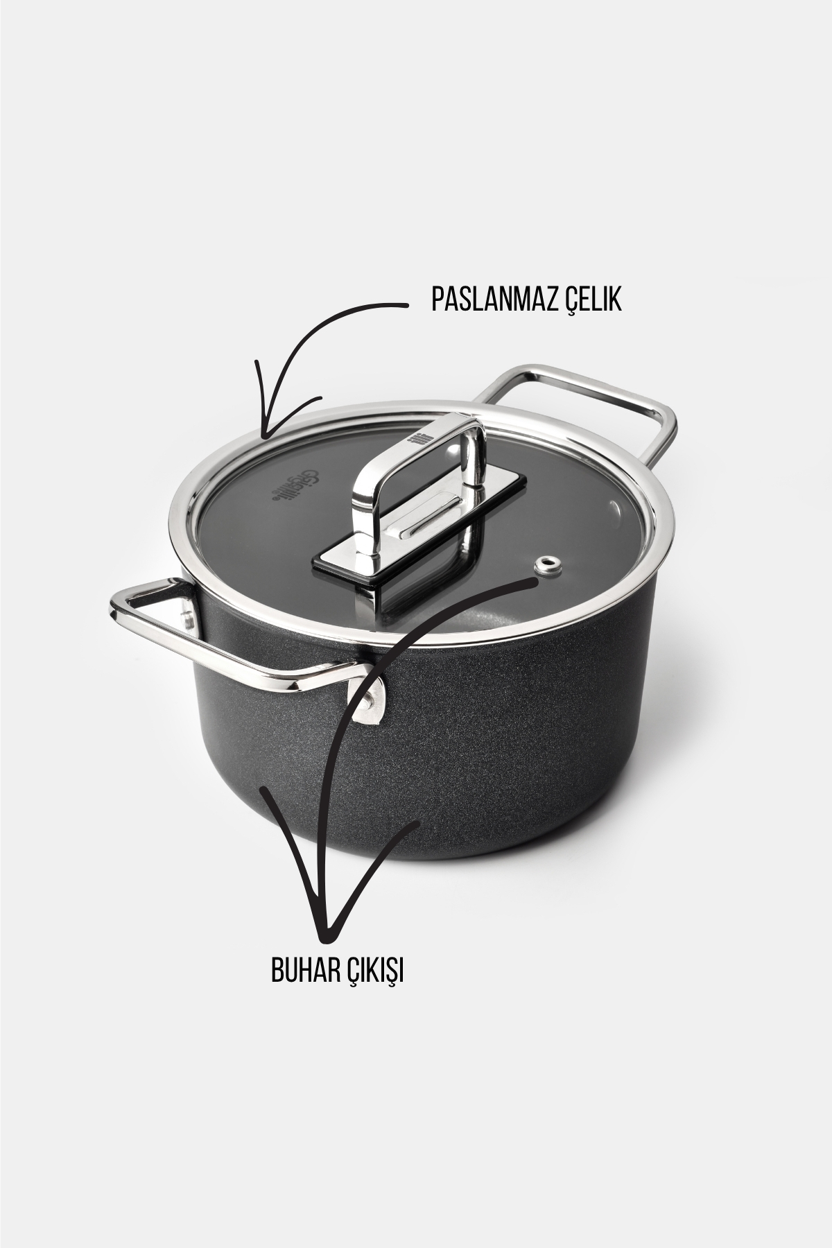 Paslanmaz çelik kenarlı, ısıya dayanıklı cam kapaklar pişirme sırasında yemeği kapağı açmadan takip etmeyi mümkün kılar. Buhar çıkışı, taşma riskini azaltmaya yardımcı olurken lezzet ve nem dengesinin korunmasına katkı sağlar. Ayrıca yüksek ısıya dayanıklı metal kulplar sayesinde tencere ve tavalar kapaksız şekilde fırında kullanılıp yemeğin devamlılığına olanak verir.
