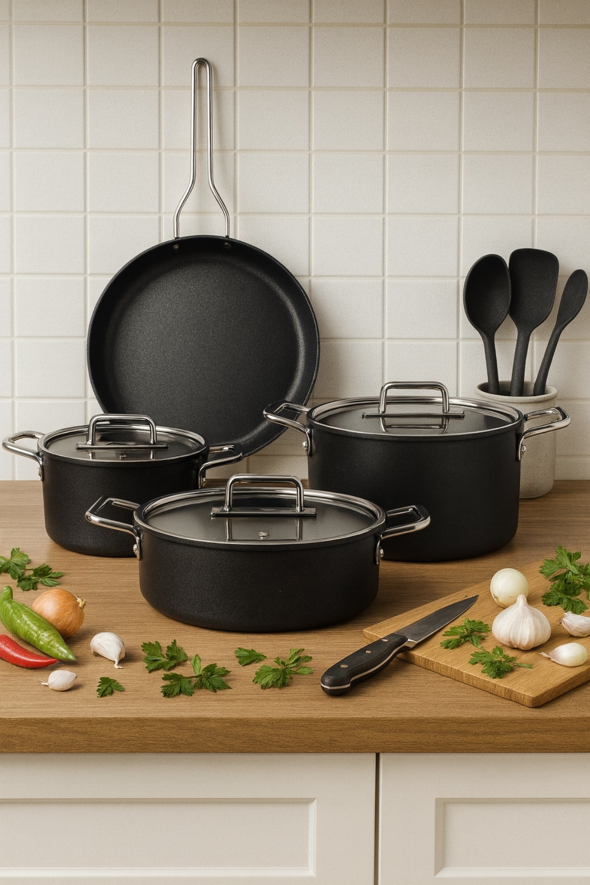 Fin 7 Parça Diamond Tencere ve Tava Seti, mutfakta farklı tariflere aynı anda hâkim olmak isteyenler için düşünülmüş dengeli bir settir. Günlük yemeklerden kalabalık sofralara kadar uzanan kullanım alanı, setin parça çeşitliliği sayesinde zahmetsiz şekilde karşılanır. Derin tencereler, basık form ve tava birlikte çalışır; ne pişireceğinizi değil, nasıl daha rahat pişireceğinizi düşünmenizi sağlar.