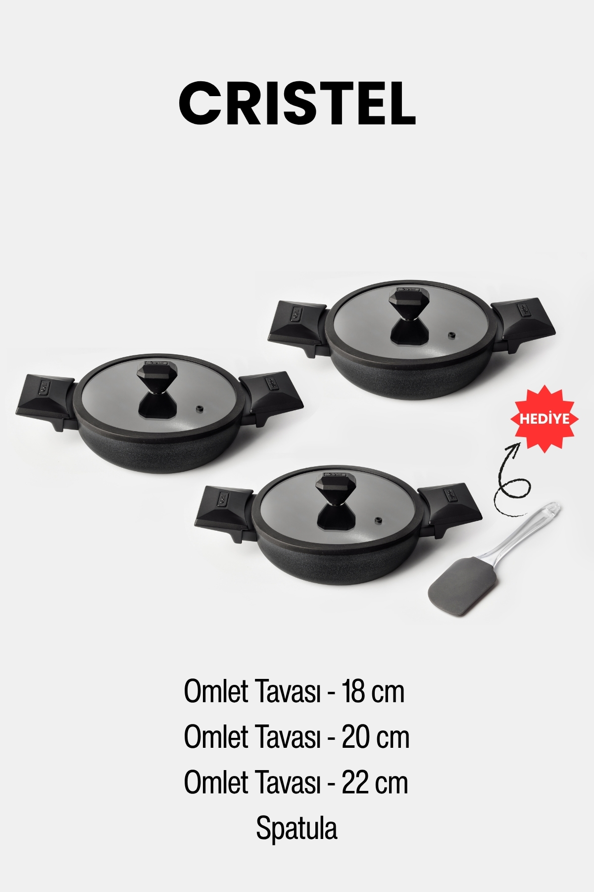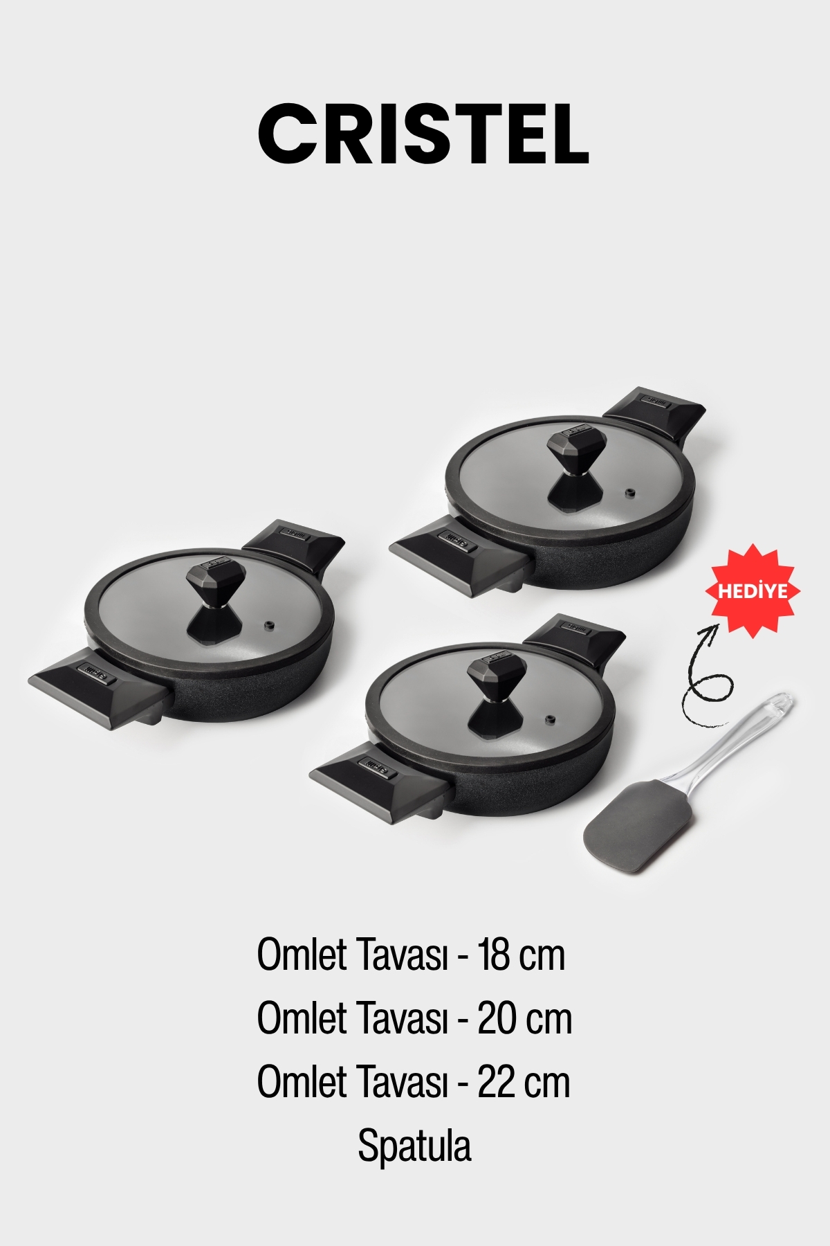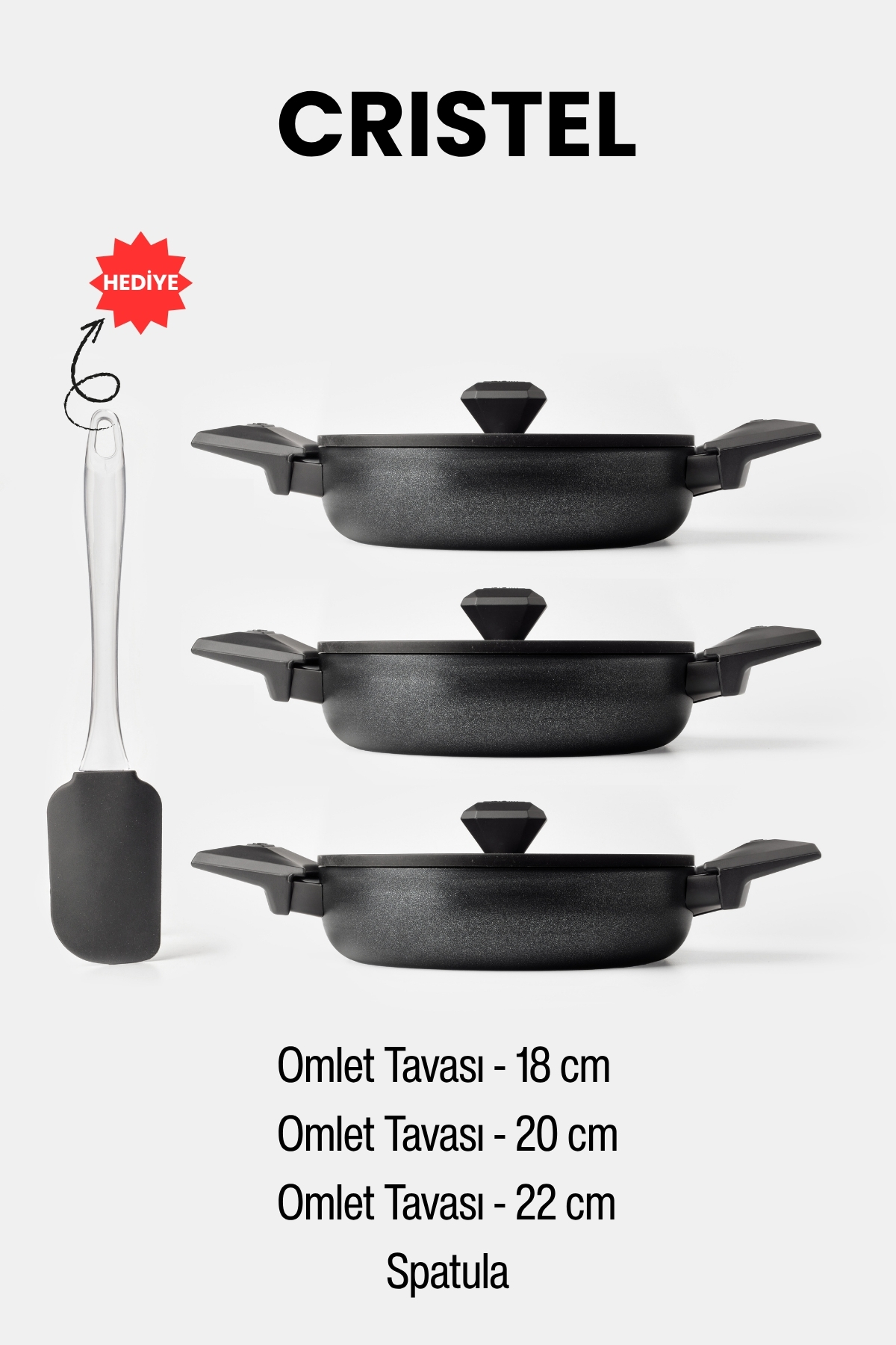 Set İçeriği: 1 adet 18 cm sahan, 1 adet 20 cm sahan, 1 adet 22 cm sahan, 1 adet silikon spatula, 3 adet kapak
